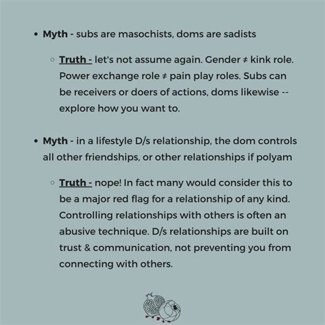 Leadership control within agreedupon boundaries. A good dominant is often highly attuned to their submissives’ needs and wellbeing , demonstrating care and responsibility. Cruelty and lack of consent are the antithesis of ethical dominance. Misconception 4: Ds/ is only about sex. While sex is often a component, Ds/ dynamics